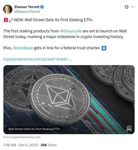 Según Eleanor Terrett, de Crypto in America, estos fondos con staking cotizan desde hoy en la bolsa estadounidense NYSE Arca. Se trata de un avance que abre nuevas posibilidades para inversores tradicionales, al permitirles obtener recompensas por staking dentro de productos financieros regulados, eliminando muchas de las barreras técnicas y de gestión que supone operar con criptomonedas directamente.