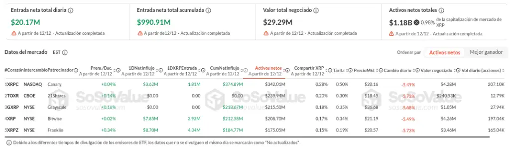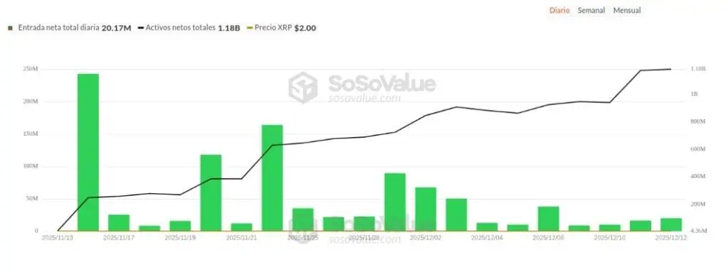 Los ETF de XRP acumularon activos netos por $1.180 millones al cierre del 15 de diciembre, impulsados por entradas constantes de capital. Ese volumen marca un crecimiento sólido que transforma estos fondos en opciones serias para inversores.