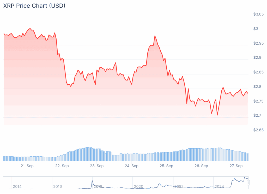 Al momento de escribir este artículo, el precio de XRP ronda los 2,74 dólares por unidad, con una corrección del 7% en la última semana. Mientras tanto, su volumen de operaciones ha descendido un 38% desde el viernes, registrando cerca de 6.000 millones de dólares en las últimas horas. Estos movimientos se producen mientras Bitcoin transita una etapa de volatilidad, cotizando inicialmente cerca de los 108.000 dólares para recuperarse posteriormente sobre los 110.000 dólares, esta semana.